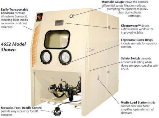 Both include a tunable media reclaimer, capable of recycling a variety of abrasives, and a cartridge-type dust collector, monitored by a minihelic gauge, contained in the same enclosure as the cabinet, along with all electrical and pneumatic interconnections between components. Forklift slots are also provided, making these units easy to move between work stations.